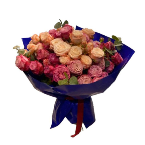 Bukiet pokazany na zdjęciu w wersji L składa się z 15-19 kolorowych kwiatów z przybraniem.
